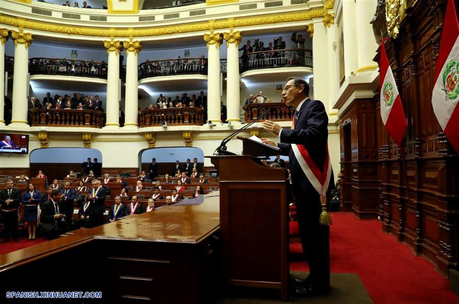 Imagen cedida por la Agencia Peruana de Noticias Andina, del presidente peruano, Martín Vizcarra, ofreciendo el Mensaje a la Nación por Fiestas Patrias, ante el Congreso Nacional, en Lima, Perú, el 28 de julio de 2019. Vizcarra, propuso el domingo adelantar para el a?o próximo las elecciones generales que se iban a celebrar en 2021. (Xinhua/Prensa Presidencial/ANDINA)