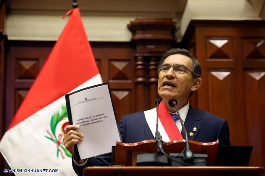 Imagen cedida por la Agencia Peruana de Noticias Andina, del presidente peruano, Martín Vizcarra, ofreciendo el Mensaje a la Nación por Fiestas Patrias, ante el Congreso Nacional, en Lima, Perú, el 28 de julio de 2019. Vizcarra, propuso el domingo adelantar para el a?o próximo las elecciones generales que se iban a celebrar en 2021. (Xinhua/Prensa Presidencial/ANDINA)