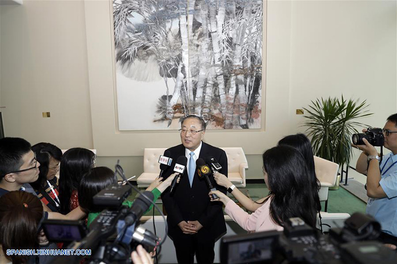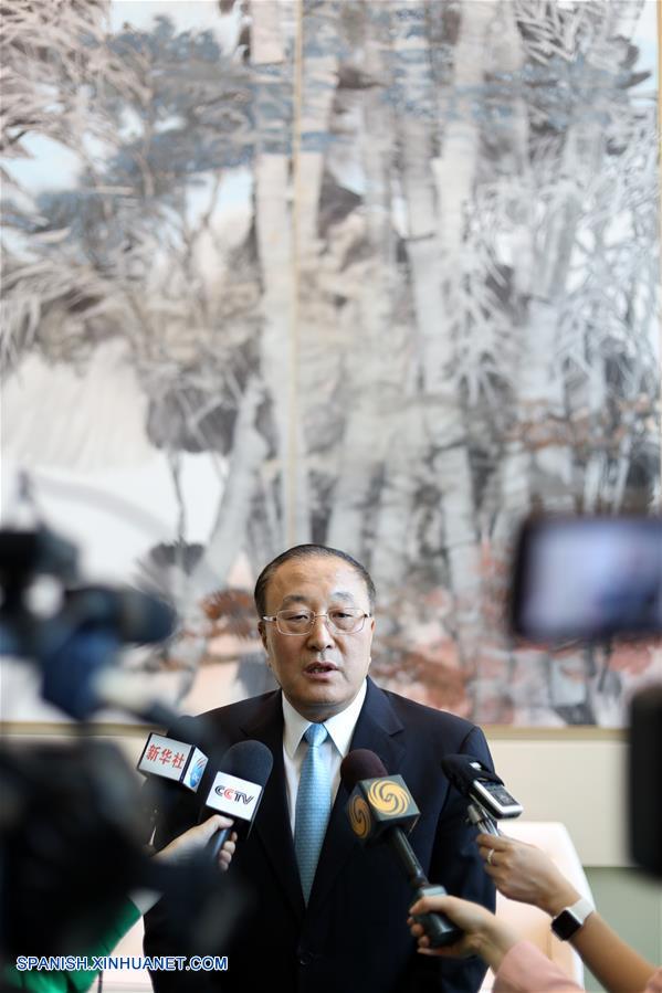 Zhang Jun, el nuevo representante permanente de China ante la Organización de las Naciones Unidas (ONU), conversa con representantes de los medios de comunicación, en la sede de la ONU, en Nueva York, Estados Unidos, el 30 de julio de 2019. En su primer día tras asumir el cargo de representante permanente de China ante la ONU, Zhang Jun prometió el martes que China, uno de los cinco miembros permanentes del Consejo de Seguridad, defenderá con firmeza el multilateralismo y apoyará a la ONU para que desempe?e un importante papel. (Xinhua/Li Muzi)