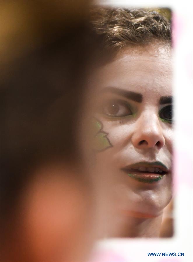 Lazara María González Gil se prepara detrás del escenario en el parque de atracciones temático de cine para el que trabaja en Changchun, provincia de Jilin, noreste de China, el 1 de agosto de 2019.
