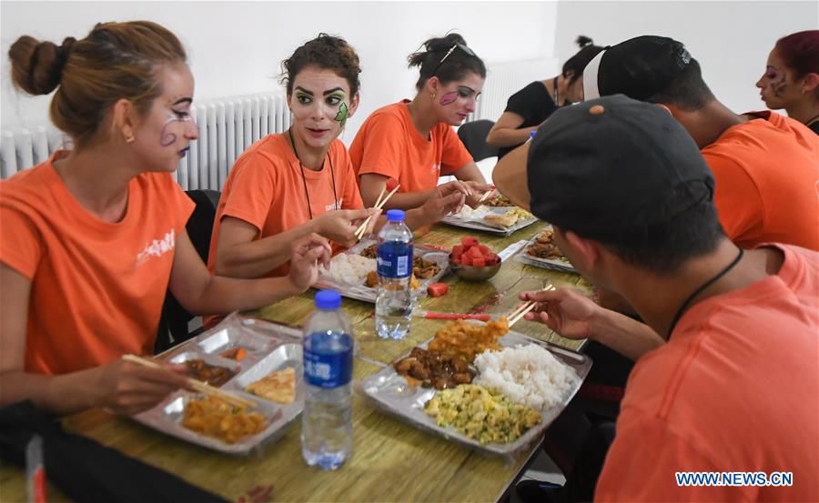 Lazara María González Gil (segunda izquierda) almuerza con compa?eros en el parque de diversiones con tema de película para el que trabaja en Changchun, provincia de Jilin, noreste de China, el 1 de agosto de 2019.