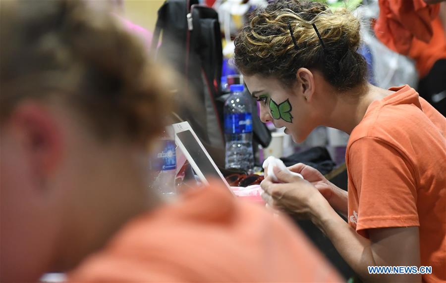 Lazara María González Gil se quita el maquillaje entre bastidores en el parque de diversiones con tema de película para el que trabaja en Changchun, provincia de Jilin, noreste de China, el 1 de agosto de 2019.