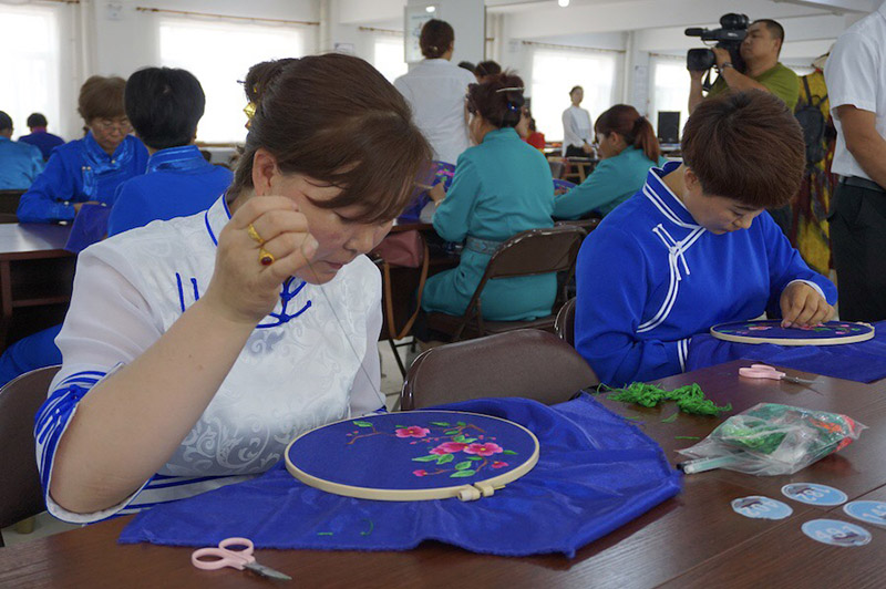 Una trabajadora borda en un taller de Mongolia Interior, 2 de agosto del 2019. [Foto: Li Ping/ Chinadaily.com.cn]