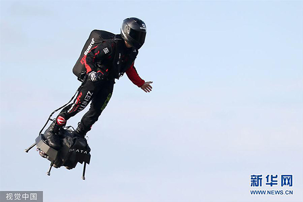 Luego volvió a despegar hacia las costas británicas, donde aterrizó tras haber recorrido los 35 km del estrecho, de pie sobre su máquina voladora dotada de cinco turborreactores de aire que permiten despegar y avanzar a hasta 190 km/h, con una autonomía de unos 10 minutos.