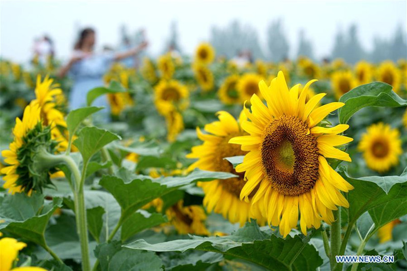 Turistas contemplan los girasoles en una platación de Shahe, provincia de Hebei, 7 de agosto del 2019. [Foto: Xinhua/Yue Wenting]
