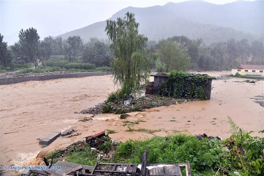 Vista de un río inundado en la aldea de Wangfen de la municipalidad de Wangfen en Qingzhou, en la provincia de Shandong, en el este de China. El tifón Lekima tocó tierra por segunda ocasión el domingo a las 20:50 horas en la costa del distrito de Huangdao, en la ciudad de Qingdao, en la provincia de Shandong, este de China, con vientos de hasta 82,8 kilómetros por hora, dijo la Administración Meteorológica de China. (Xinhua/Guo Xulei)