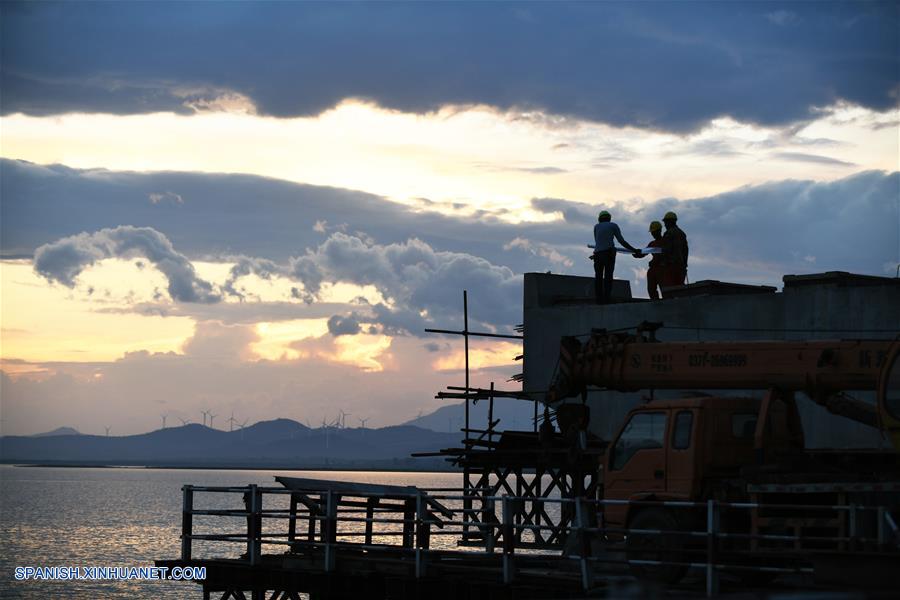 JIANGXI, 11 agosto, 2019 (Xinhua) -- Imagen del 10 de agosto de 2019 de trabajadores laborando en el sitio de construcción del Gran Puente del Lago Xinmiao en el condado de Duchang de Jiujiang, en la provincia de Jiangxi, en el este de China. El Gran Puente del Lago Xinmiao bajo construcción está dise?ado para tener 2.292,5 metros de largo con seis carriles. Una vez terminado, el puente desempe?ará un importante papel en la mejora del transporte regional y la promoción del turismo. (Xinhua/Yang Wenbin)