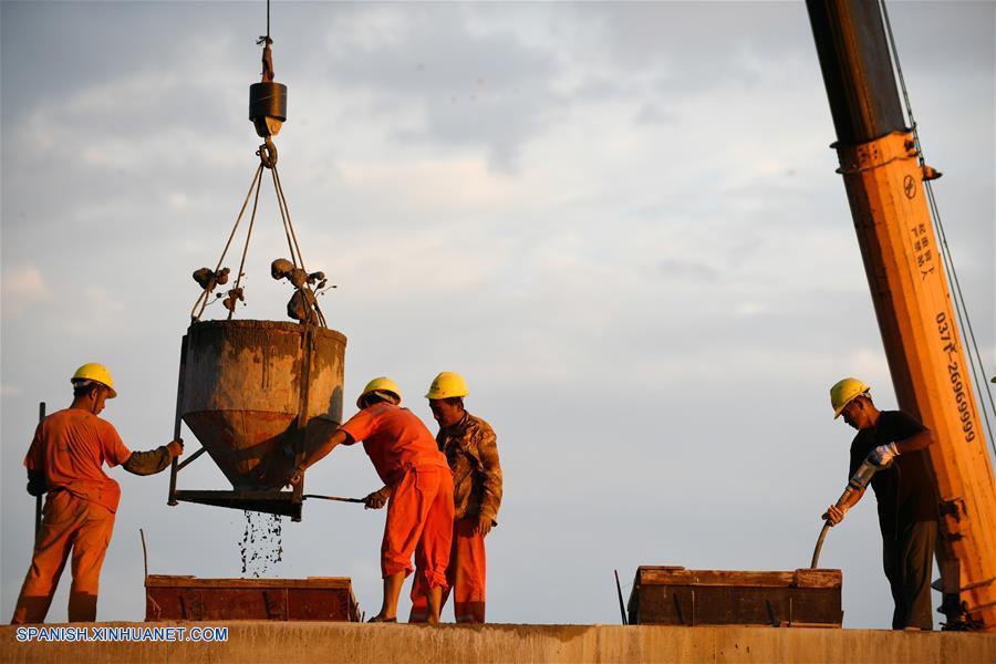 JIANGXI, 11 agosto, 2019 (Xinhua) -- Imagen del 10 de agosto de 2019 de trabajadores laborando en el sitio de construcción del Gran Puente del Lago Xinmiao en el condado de Duchang de Jiujiang, en la provincia de Jiangxi, en el este de China. El Gran Puente del Lago Xinmiao bajo construcción está dise?ado para tener 2.292,5 metros de largo con seis carriles. Una vez terminado, el puente desempe?ará un importante papel en la mejora del transporte regional y la promoción del turismo. (Xinhua/Yang Wenbin)