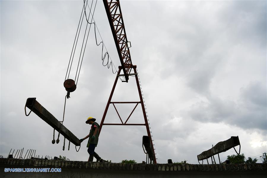 JIANGXI, 11 agosto, 2019 (Xinhua) -- Imagen del 10 de agosto de 2019 de un trabajador laborando en el sitio de construcción del Gran Puente del Lago Xinmiao en el condado de Duchang de Jiujiang, en la provincia de Jiangxi, en el este de China. El Gran Puente del Lago Xinmiao bajo construcción está dise?ado para tener 2.292,5 metros de largo con seis carriles. Una vez terminado, el puente desempe?ará un importante papel en la mejora del transporte regional y la promoción del turismo. (Xinhua/Yang Wenbin)