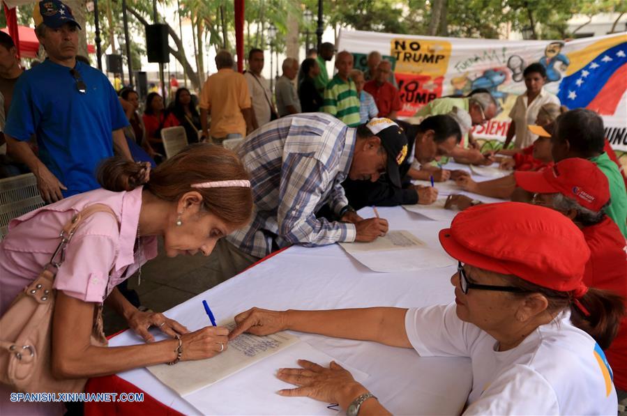 Personas firman durante la jornada mundial de protesta "No más Trump", en la Plaza Bolívar de Caracas, Venezuela, el 11 de agosto de 2019. La jornada mundial de protesta "No más Trump" continúa el domingo en las distintas plazas de Venezuela, en rechazo al bloqueo del gobierno de Estados Unidos y se extenderá a todos los rincones, informó el constituyente Darío Vivas. (Xinhua/Str)