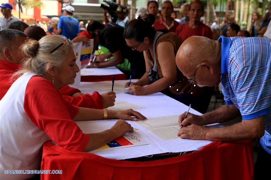 Personas firman durante la jornada mundial de protesta "No más Trump", en la Plaza Bolívar de Caracas, Venezuela, el 11 de agosto de 2019. La jornada mundial de protesta "No más Trump" continúa el domingo en las distintas plazas de Venezuela, en rechazo al bloqueo del gobierno de Estados Unidos y se extenderá a todos los rincones, informó el constituyente Darío Vivas. (Xinhua/Str)
