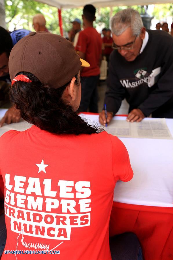 Una persona firma durante la jornada mundial de protesta "No más Trump", en la Plaza Bolívar de Caracas, Venezuela, el 11 de agosto de 2019. La jornada mundial de protesta "No más Trump" continúa el domingo en las distintas plazas de Venezuela, en rechazo al bloqueo del gobierno de Estados Unidos y se extenderá a todos los rincones, informó el constituyente Darío Vivas. (Xinhua/Str)