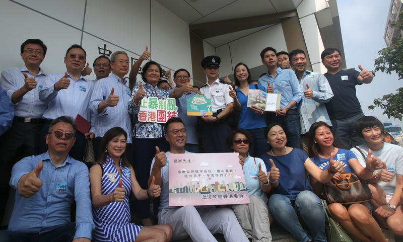 Grupos de residentes se reúnen a la entrada de la Estación Central de la Policía de Hong Kong para evidenciar su apoyo a las fuerzas del orden público, Hong Kong, 10 de agosto del 2019. [Foto: China Daily]