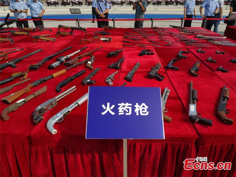Armas de fuego incautadas por la policía, entre las que se incluyen pistolas de aire comprimido y rifles de caza, serán destruidos, 12 de agosto del 2019. El Ministerio de Seguridad Pública de China organizó un evento simultáneo en 154 ciudades –en Wuhan se celebró el acto central- para destruir un total de 107.000 armas, explosivos y detonadores incautados a partir del a?o pasado gracias a los operativos que buscan aumentar la seguridad ciudadana. [Foto: China News Service/Zhang Ziyang]
