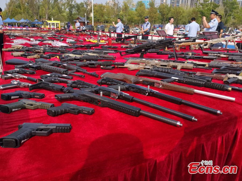 Armas de fuego incautadas por la policía, entre las que se incluyen pistolas de aire comprimido y rifles de caza, serán destruidos, 12 de agosto del 2019. El Ministerio de Seguridad Pública de China organizó un evento simultáneo en 154 ciudades –en Wuhan se celebró el acto central- para destruir un total de 107.000 armas, explosivos y detonadores incautados a partir del a?o pasado gracias a los operativos que buscan aumentar la seguridad ciudadana. [Foto: China News Service/Zhang Ziyang]