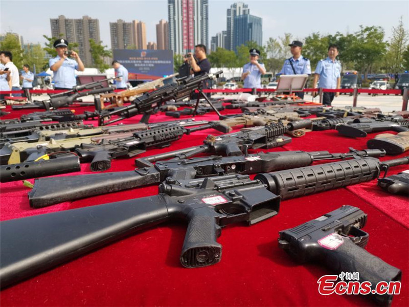 Wuhan, 13/08/2019 (El Pueblo en Línea) - Armas de fuego incautadas por la policía, entre las que se incluyen pistolas de aire comprimido y rifles de caza, serán destruidos, 12 de agosto del 2019. El Ministerio de Seguridad Pública de China organizó un evento simultáneo en 154 ciudades –en Wuhan se celebró el acto central- para destruir un total de 107.000 armas, explosivos y detonadores incautados a partir del a?o pasado gracias a los operativos que buscan aumentar la seguridad ciudadana. [Foto: China News Service/Zhang Ziyang]