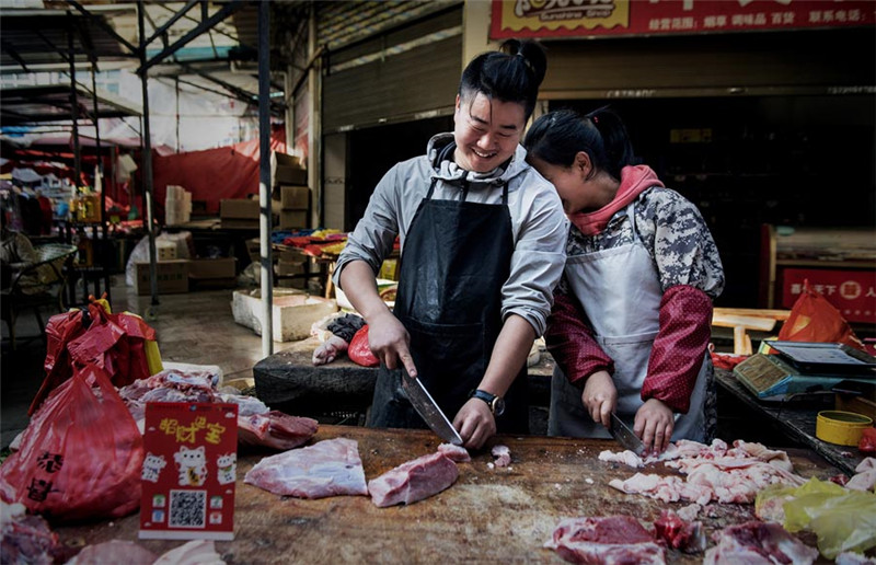 Pareja recién casada vendiendo carne en un mercado de Wudu, Shangrao, provincia de Jiangxi, abril del 2019. [Foto: cpanet.org.cn/ Zhou Lihe]