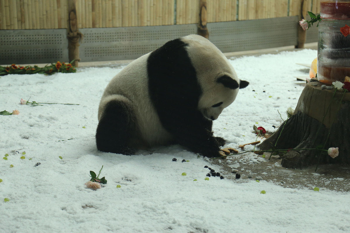 Sijia disfruta de su tarta de cumplea?os en la estación de esquí Yabuli. [Foto: proporcionada]