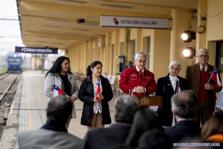 CHILLAN, 20 agosto, 2019 (Xinhua) -- Imagen cedida por la Presidencia de Chile, del presidente chileno, Sebastián Pi?era (c), hablando durante la presentación del nuevo servicio de tren de pasajeros Chillán-Alameda, en la Estación de Trenes de Chillán, en la ciudad de Chillán, en Chile, el 20 de agosto de 2019. Pi?era anunció el martes un nuevo servicio exprés de trenes de pasajeros que irá de la capital Santiago a Chillán, una ciudad de la zona centro del país. (Xinhua/Sebastián Rodríguez/Presidencia de Chile)