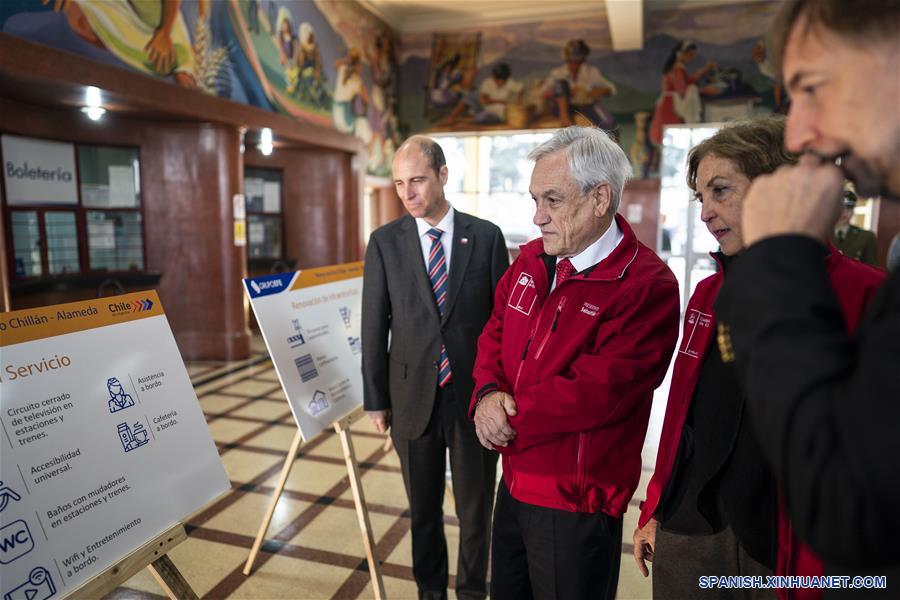 Imagen cedida por la Presidencia de Chile, del presidente chileno, Sebastián Pi?era (2-i), revisando un cartel que describe los servicios que tendrá el nuevo tren de pasajeros Chillán-Alameda, en la Estación de Trenes de Chillán, en la ciudad de Chillán, en Chile, el 20 de agosto de 2019. Pi?era anunció el martes un nuevo servicio exprés de trenes de pasajeros que irá de la capital Santiago a Chillán, una ciudad de la zona centro del país. (Xinhua/Sebastián Rodríguez/Presidencia de Chile)