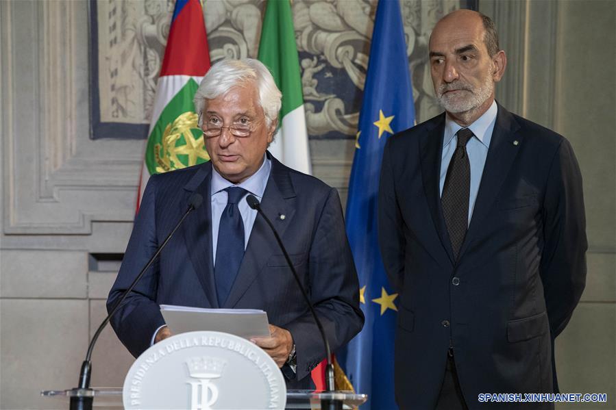 ROMA, 20 agosto, 2019 (Xinhua) -- El secretario presidencial italiano, Ugo Zampetti (i), lee una declaración en la oficina del presidente, Sergio Mattarella, en Roma, Italia, el 20 de agosto de 2019. El primer ministro de Italia, Giuseppe Conte presentó el martes su renuncia al presidente de la república, con lo que pone fin a su gobierno de cerca de 14 meses. (Xinhua/Palazzo del Quirinale)