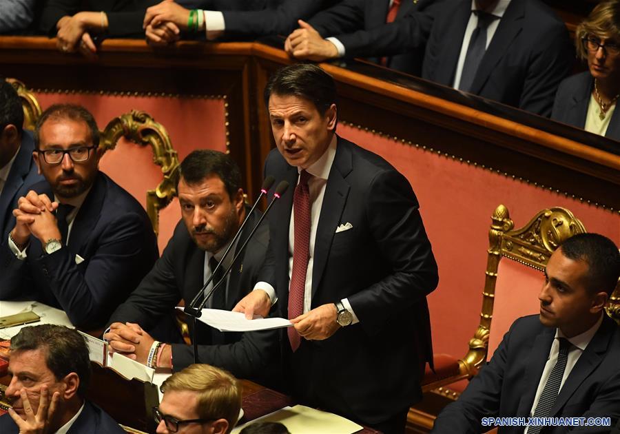 El primer ministro de Italia, Giuseppe Conte, pronuncia un discurso ante la cámara alta del senado, en Roma, Italia, el 20 de agosto de 2019. Conte presentó el martes su renuncia al presidente de la república, con lo que pone fin a su gobierno de cerca de 14 meses. (Xinhua/Alberto Lingria)