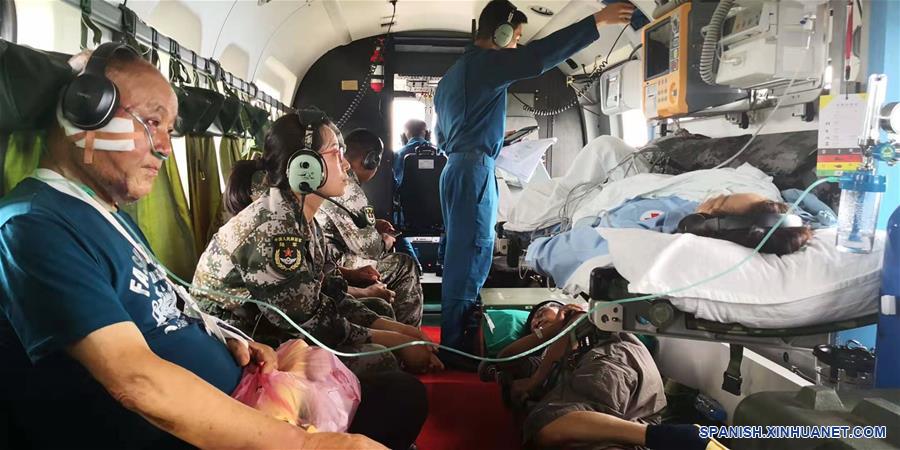 Imagen del 22 de agosto de 2019 de turistas chinos heridos siendo atendidos en el interior de un helicóptero de rescate Z-8G del equipo médico "Tren de la Paz" del Ejército Popular de Liberación de China (EPL), en el norte de Laos. El equipo médico "Tren de la Paz" del Ejército Popular de China (EPL) acompa?ó a cuatro turistas chinos que resultaron heridos de gravedad en el choque de un autobús en el norte de Laos para que hicieran un vuelo de vuelta a China el jueves por la tarde. El equipo chino asiste al ejercicio conjunto de rescate humanitario y médico realizado por China y Laos llamado "Tren de la paz-2019". (Xinhua/Equipo Médico Tren de la Paz)