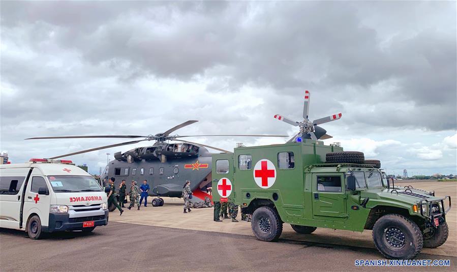 Imagen del 22 de agosto de 2019 de miembros del equipo médico "Tren de la Paz" del Ejército Popular de Liberación de China (EPL), transportando a turistas chinos heridos hacia un helicóptero de rescate Z-8G en el norte de Laos. El equipo médico "Tren de la Paz" del Ejército Popular de China (EPL) acompa?ó a cuatro turistas chinos que resultaron heridos de gravedad en el choque de un autobús en el norte de Laos para que hicieran un vuelo de vuelta a China el jueves por la tarde. El equipo chino asiste al ejercicio conjunto de rescate humanitario y médico realizado por China y Laos llamado "Tren de la paz-2019". (Xinhua/Equipo Médico Tren de la Paz)