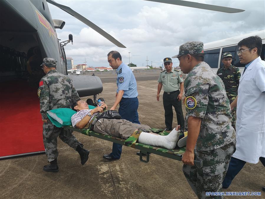 Imagen del 22 de agosto de 2019 de miembros del equipo médico "Tren de la Paz" del Ejército Popular de Liberación de China (EPL), transportando a un turista chino herido hacia un helicóptero de rescate Z-8G en el norte de Laos. El equipo médico "Tren de la Paz" del Ejército Popular de China (EPL) acompa?ó a cuatro turistas chinos que resultaron heridos de gravedad en el choque de un autobús en el norte de Laos para que hicieran un vuelo de vuelta a China el jueves por la tarde. El equipo chino asiste al ejercicio conjunto de rescate humanitario y médico realizado por China y Laos llamado "Tren de la paz-2019". (Xinhua/Equipo Médico Tren de la Paz)