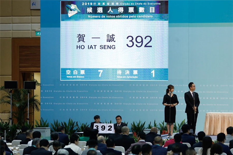 Después del procedimiento de votación que duró unos 30 minutos, Song Man Lei, presidente del comité electoral, anunció al comité electoral y a los medios de comunicación: "El Sr. Ho Iat Seng obtuvo 392 votos. Por lo tanto ha sido electo como jefe ejecutivo de Macao".