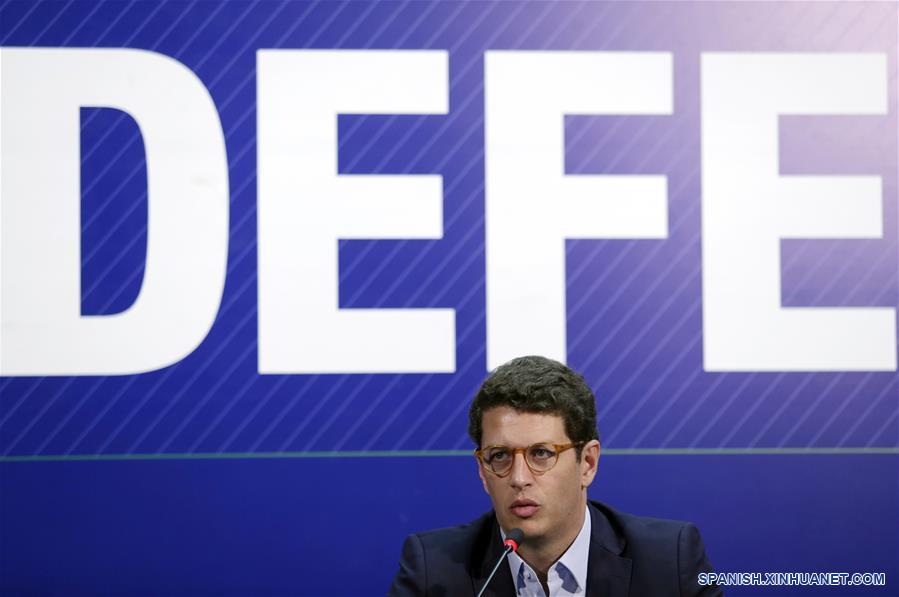 El ministro de Medio Ambiente brasile?o, Ricardo Salles, asiste a una rueda de prensa, en Brasilia, Brasil, el 24 de agosto de 2019. El gobierno de Brasil ofreció ayuda federal a los gobiernos de la región amazónica para combatir el fuego y puso a su disposición las Fuerzas Armadas para combatir los incendios, que han levantado una gran polémica internacional. (Xinhua/Lucio Tavora)