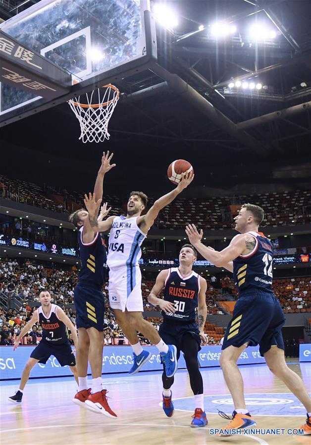 NINGBO, 26 agosto, 2019 (Xinhua) -- Nicolas Laprovittola (c), de Argentina, intenta anotar durante el Torneo Internacional Varonil de Baloncesto 2019, ante Rusia, en Ningbo, en la provincia de Zhejiang, en el este de China, el 26 de agosto de 2019. (Xinhua/Huang Zongzhi)