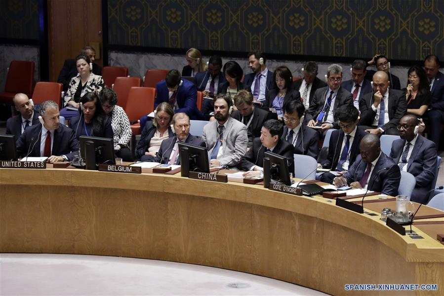 Wu Haitao (2-d-frente), representante permanente asistente de China ante la Organización de las Naciones Unidas (ONU), participa en una reunión del Consejo de Seguridad sobre la Operación Híbrida de la ONU y la Unión Africana en Darfur (UNAMID, por sus siglas en inglés), en la sede de la ONU, en Nueva York, Estados Unidos, el 26 de agosto de 2019. Wu Haitao pidió el lunes a la comunidad internacional apoyar al gobierno sudanés para que asuma la principal responsabilidad en el mantenimiento de la seguridad en Darfur, Sudán. (Xinhua/Li Muzi)