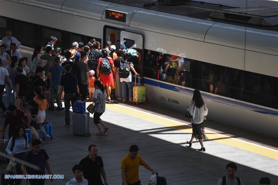 FUJIAN, 27 agosto, 2019 (Xinhua) -- Una ni?a se prepara para abordar un tren en la Estación del Ferrocarril de Fuzhou, en la provincia de Fujian, en el sureste de China, el 27 de agosto de 2019. El sistema ferroviario ha sido testigo de una oleada de viajes recientemente ya que la temporada alta del "transporte de verano" de este a?o llegará a su fin el 31 de agosto. (Xinhua/Song Weiwei)