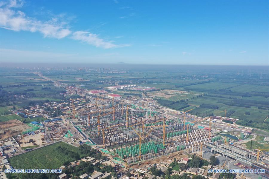 HEBEI, 27 agosto, 2019 (Xinhua) -- Vista aérea del sitio de construcción de la Estacion de Xiongan, del tren de alta velocidad interurbano Beijing-Xiongan en la Nueva Area de Xiongan, en la provincia de Hebei, en el norte de China, el 27 de agosto de 2019. Cubriendo un área de 470.000 metros cuadrados, la Estación de Xiongan consiste en tres pisos sobre el suelo y dos pisos debajo del suelo. La principal estructura subterránea será completada en un futuro cercado y los trabajadores se moverán a la construcción sobre el suelo. (Xinhua/Xing Guangli)