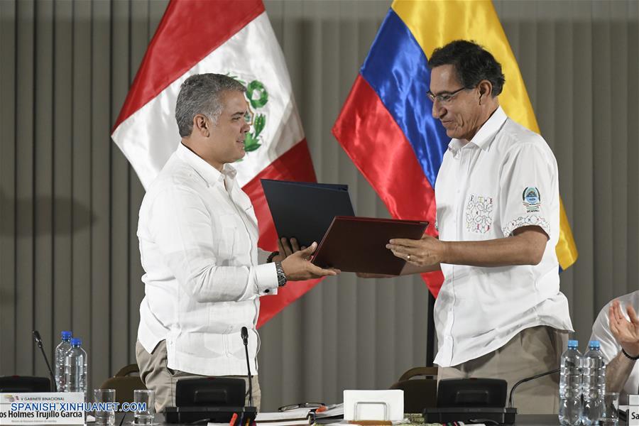 Imagen cedida por la Presidencia de Colombia, del presidente peruano, Martín Vizcarra (d) intercambiando convenios con su homólogo colombiano, Iván Duque (i), durante el V Gabinete Binacional, en la ciudad de Pucallpa, en Perú, el 27 de agosto de 2019. Vizcarra y Duque se comprometieron el martes, en el marco del V Gabinete Binacional, a trabajar de manera conjunta por el desarrollo y protección de la Amazonia, que en las últimas semanas ha sufrido fuertes incendios. (Xinhua/Efraín Herrera/Presidencia de Colombia)