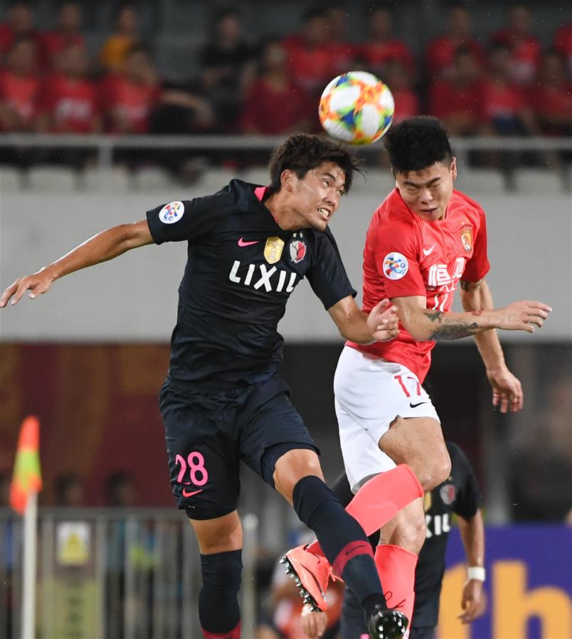 GUANGZHOU, 28 agosto, 2019 (Xinhua) -- El jugador Yang Liyu (d), de Guangzhou Evergrande, disputa el balón con Koki Machida (i), de Kashima Antlers, durante el partido correspondiente a la Liga de Campeones de la Confederación Asiática de Fútbol (AFC, por sus siglas en inglés), en Guangzhou, provincia de Guangdong, en el sur de China, el 28 de agosto de 2019. (Xinhua/Deng Hua)