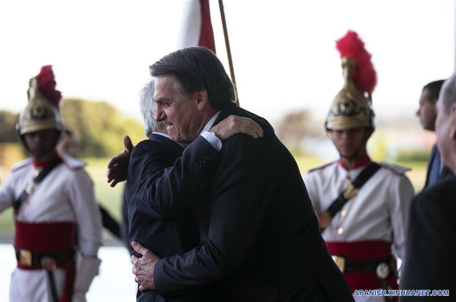 Imagen cedida por la Presidencia de Chile, del presidente brasile?o, Jair Bolsonaro (d), abrazándose con el presidente chileno, Sebastián Pi?era (i), en Brasilia, Brasil, el 28 de agosto de 2019. Los presidentes de Brasil, Jair Bolsonaro, y de Chile, Sebastián Pi?era, quienes el miércoles se reunieron en Brasilia, expresaron en forma conjunta que los "desafíos ambientales" deben enfrentarse con respeto a la soberanía. (Xinhua/Marcelo Segura/Presidencia de Chile)