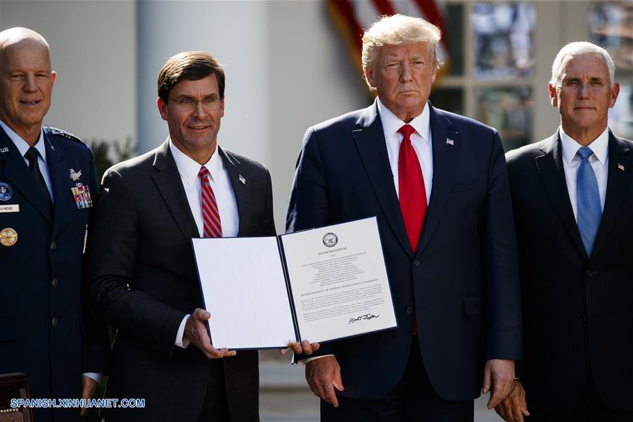 El presidente estadounidense, Donald Trump (2-d), asiste a una ceremonia en la Casa Blanca, en Washington D.C., Estados Unidos, el 29 de agosto de 2019. El gobierno estadounidense anunció el jueves el establecimiento del Comando Espacial de Estados Unidos para defender sus intereses en el espacio. (Xinhua/Ting Shen)