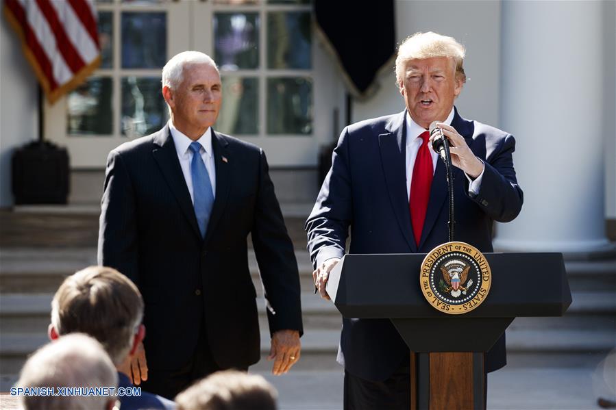 El presidente estadounidense, Donald Trump (d), habla durante una ceremonia en la Casa Blanca, en Washington D.C., Estados Unidos, el 29 de agosto de 2019. El gobierno estadounidense anunció el jueves el establecimiento del Comando Espacial de Estados Unidos para defender sus intereses en el espacio. (Xinhua/Ting Shen)
