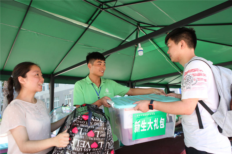 En el "canal verde" de la Universidad de Chongqing, un estudiante de primer a?o recibe una bolsa subsidiada que incluye artículos de primera necesidad. (Foto: Chen Shichuan/ China Daily)