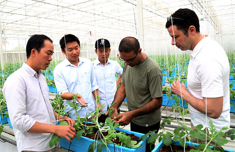 Los especialistas de países en desarrollo que asisten a un curso de capacitación sobre la producción de frutas tropicales visitan un invernadero en Hainan. [Foto: China Daily]