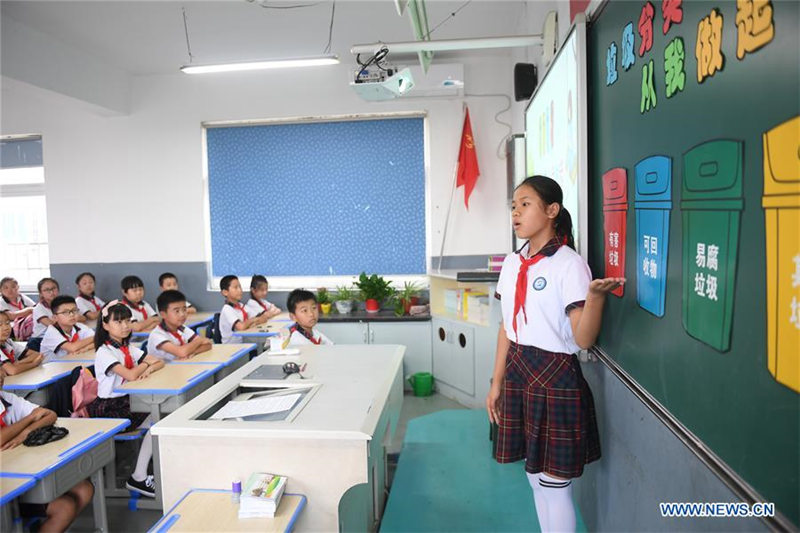 Estudiantes de primaria participan en un juego sobre clasificación de la basura en Hefei, provincia de Anhui. El lunes se llevó a cabo un evento para sensibilizar a los ni?os sobre la clasificación de la basura y la conservación de los recursos naturales, el 2 de septiembre del 2019, (Foto: Xinhua / Liu Junxi)