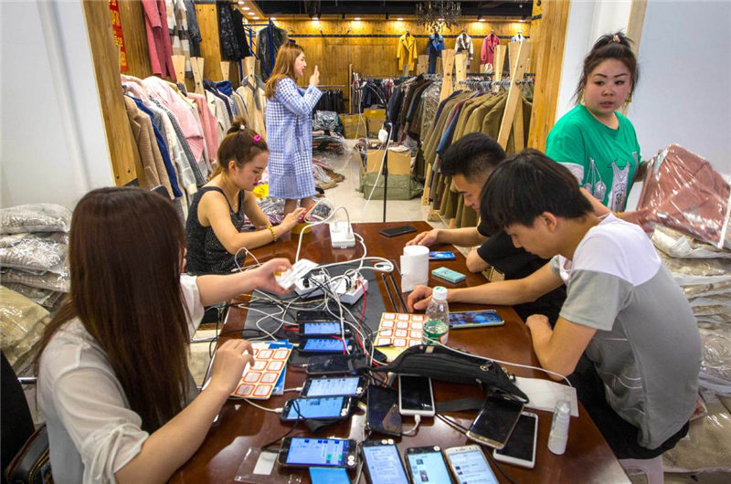 Un equipo se prepara para vender ropa durante una sesión de transmisión en vivo vía Intetrnet en Shenyang, provincia de Liaoning. [Foto: China Daily]