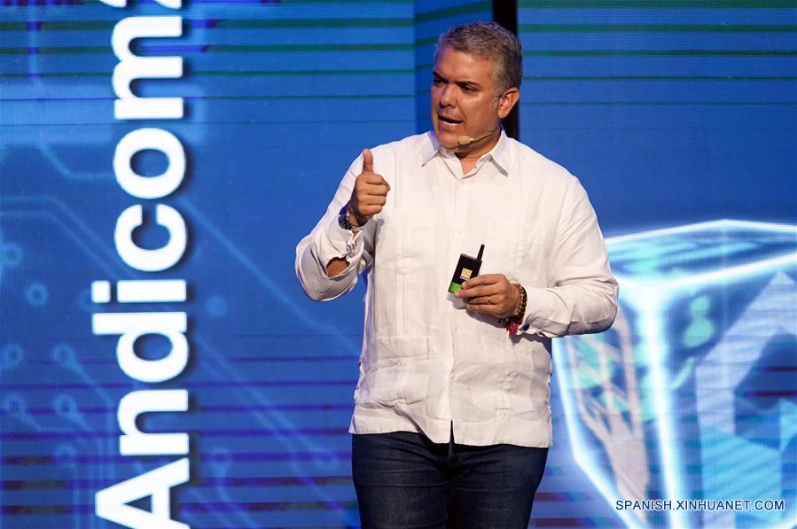 CARTAGENA, 4 septiembre, 2019 (Xinhua) -- El presidente de Colombia, Iván Duque, da una conferencia durante la apertura del Congreso Internacional de Tecnologías de la Información y las Comunicaciones (TIC) Andicom 2019, en la ciudad de Cartagena, Colombia, el 4 de septiembre de 2019. Alrededor de 3.000 asistentes participarán en la versión 34 del TIC Andicom 2019, donde se conocerán las últimas tendencias tecnológicas y modelos de negocio por parte de los líderes globales de la industria. El congreso se llevará a cabo del 4 al 6 de septiembre. (Xinhua/Jhon Paz)
