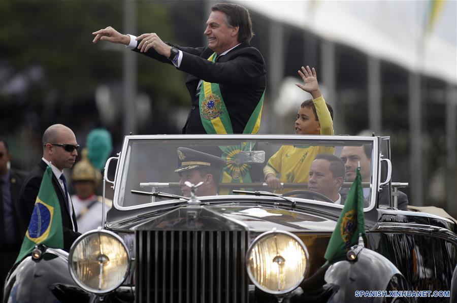 El presidente de Brasil, Jair Bolsonaro (c), participa en el desfile militar del Día de la Independencia de Brasil en la Explanada de los Ministerios, en Brasilia, Brasil, el 7 de septiembre de 2019. Bolsonaro encabezó el sábado el tradicional desfile militar por el Día de la Independencia de Brasil en el marco de la celebración del 197 aniversario de la proclamación de la Independencia de Brasil presentada por el Imperio de Brasil el 7 de septiembre de 1822. (Xinhua/Lucio Tavora)