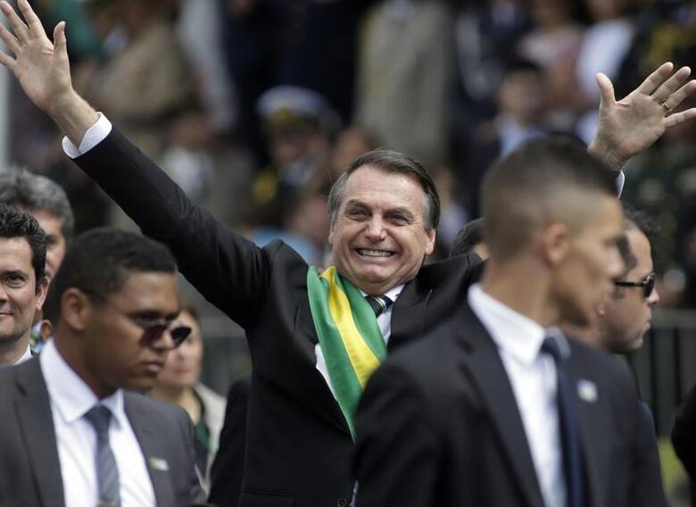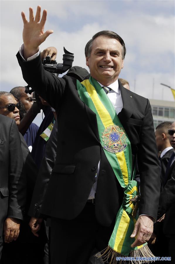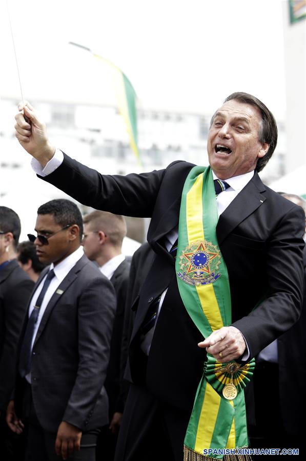 El presidente de Brasil, Jair Bolsonaro (frente), gesticula durante el desfile militar del Día de la Independencia de Brasil en la Explanada de los Ministerios, en Brasilia, Brasil, el 7 de septiembre de 2019. Bolsonaro encabezó el sábado el tradicional desfile militar por el Día de la Independencia de Brasil en el marco de la celebración del 197 aniversario de la proclamación de la Independencia de Brasil presentada por el Imperio de Brasil el 7 de septiembre de 1822. (Xinhua/Lucio Tavora)