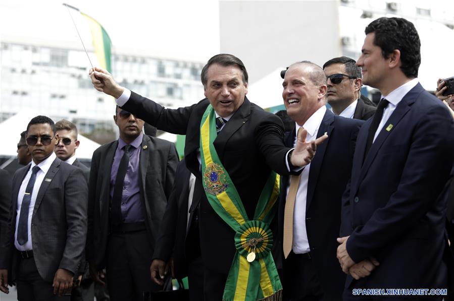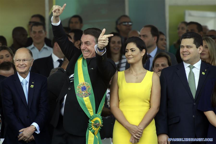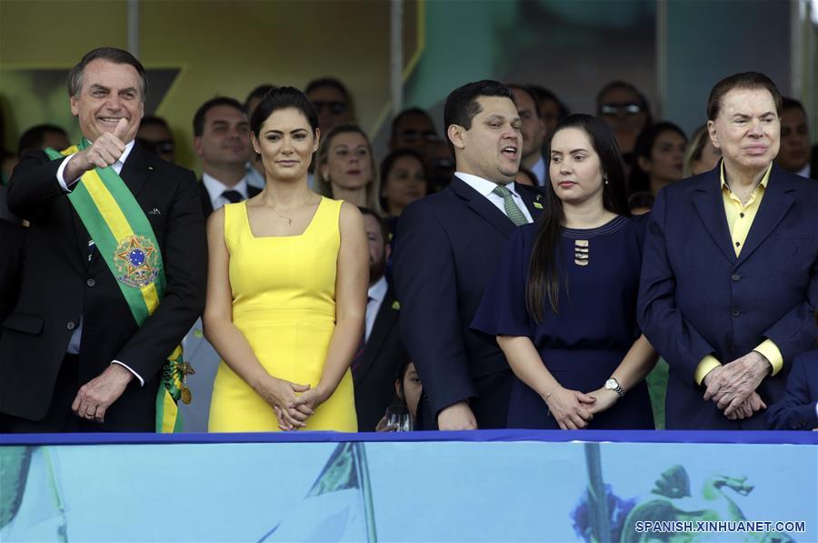 El presidente de Brasil, Jair Bolsonaro (2-i), acompa?ado por su esposa, Michelle Bolsonaro (2-d), y el presidente del Senado Federal de Brasil, Davi Alcolumbre (d), participa en el desfile militar del Día de la Independencia de Brasil en la Explanada de los Ministerios, en Brasilia, Brasil, el 7 de septiembre de 2019. Bolsonaro encabezó el sábado el tradicional desfile militar por el Día de la Independencia de Brasil en el marco de la celebración del 197 aniversario de la proclamación de la Independencia de Brasil presentada por el Imperio de Brasil el 7 de septiembre de 1822. (Xinhua/Lucio Tavora)