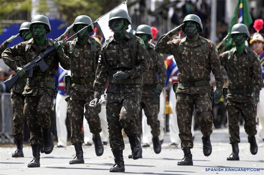 Soldados del Ejército brasile?o marchan durante el desfile militar del Día de la Independencia de Brasil en la Explanada de los Ministerios, en Brasilia, Brasil, el 7 de septiembre de 2019. El presidente de Brasil, Jair Bolsonaro, encabezó el sábado el tradicional desfile militar por el Día de la Independencia de Brasil en el marco de la celebración del 197 aniversario de la proclamación de la Independencia de Brasil presentada por el Imperio de Brasil el 7 de septiembre de 1822. (Xinhua/Lucio Tavora)