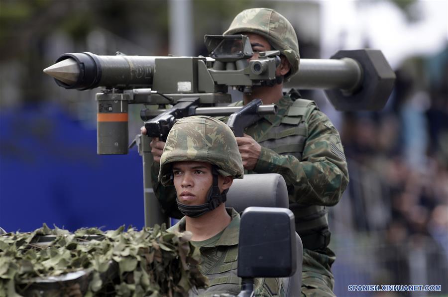 Soldados del Ejército brasile?o a bordo de un vehículo militar participan durante el desfile militar del Día de la Independencia de Brasil en la Explanada de los Ministerios, en Brasilia, Brasil, el 7 de septiembre de 2019. El presidente de Brasil, Jair Bolsonaro, encabezó el sábado el tradicional desfile militar por el Día de la Independencia de Brasil en el marco de la celebración del 197 aniversario de la proclamación de la Independencia de Brasil presentada por el Imperio de Brasil el 7 de septiembre de 1822. (Xinhua/Lucio Tavora)